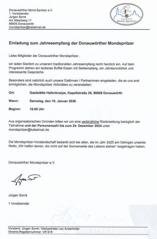 Die Donauwörther Mondspritzer veranstalteten ihren traditionellen Jahresempfang am 10. Januar 2026 in ihrem Stammlokal, der Hafenkneipe in Donauwörth. Mit 37 Teilnehmern war die Veranstaltung sehr gut besucht. Das tolle Buffet, das die Hafenkneipe festlich im Nebenzimmer aranchierte, wurde begeistert angenommen.